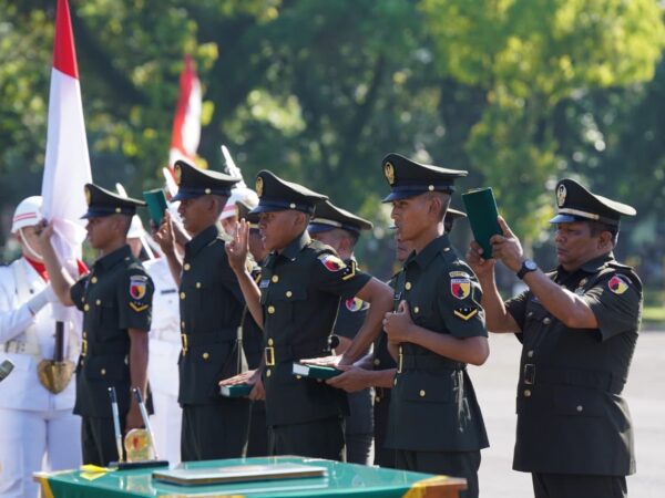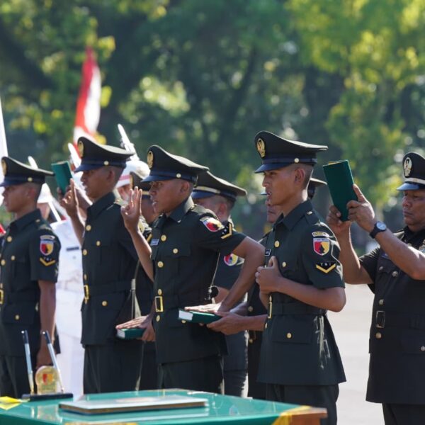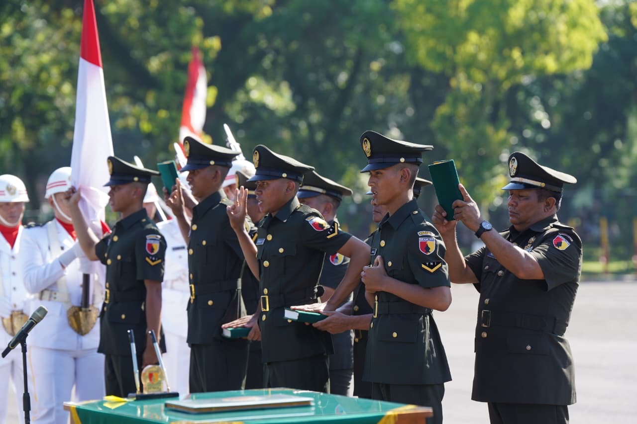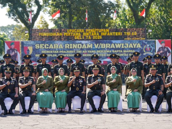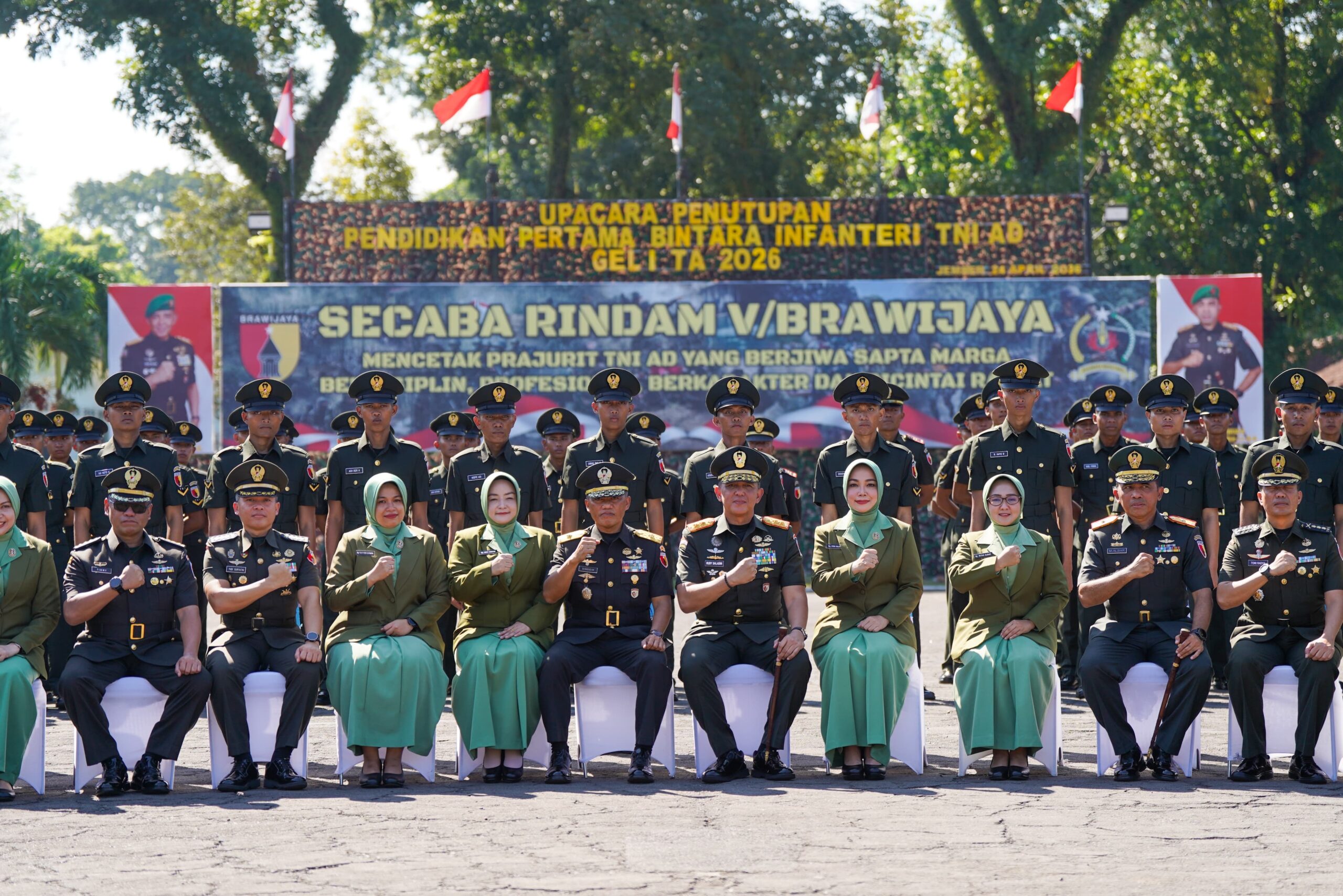 JEMBER, Sabtu 25 April 2026 – Ketua Persit Kartika Chandra Kirana PD V/Brawijaya Ibu Vira Rudy Saladin mendampingi Bapak Pangdam V/Brawijaya, Mayjen TNI Rudy Saladin, M.A menghadiri upacara penutupan Dikmaba Infanteri TNI