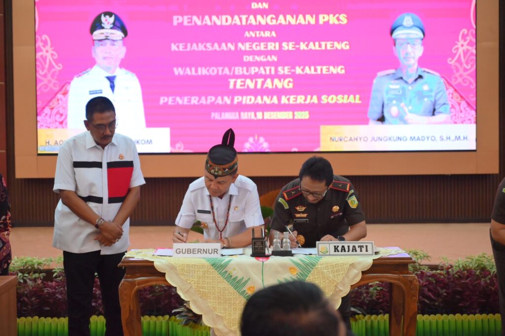 PALANGKA RAYA, Kamis 18 Desember 2025 – Kamis, tanggal 18 Desember 2025, bertempat di Aula Kantor Kejaksaan Tinggi Kalimantan Tengah dilaksanakan Penandatanganan MoU Antara Kejaksaan Tinggi Kalimantan Tengah Dengan Pemerintah Provinsi Kalimantan Tengah Dan PKS Antara Kejaksaan Negeri Se- Kalimantan Tengah Dengan Pemerintah Kabupaten/Kota Terkait Penerapan Pidana Kerja Sosial Bagi Pelaku Tindak Pidana Dalam Rangka Pemberlakuan KUHP 2023. Acara ini dihadiri oleh Gubernur Kalimantan Tengah (Kalteng) H. Agustiar Sabran A, S.Ikom, Kepala Kejaksaan Tinggi Kalimantan Tengah Nurcahyo J.M., S.H., M.H. beserta Forkopimda Provinsi Kalimantan Tengah, Jajaran Pejabat Utama Kejaksaan Tinggi Kalimantan Tengah, Jajaran OPD Provinsi Kalimantan Tengah, Bupati / Walikota Se – Kalimantan Tengah beserta Jajaran dan Kepala Kejaksaan Negeri se- Kalimantan Tengah beserta jajaran. Turut hadir dalam acara tersebut Agoes Soenanto Prasetyo, S.H., M.H., Direktur C pada Jaksa Agung Muda Tindak Pidana Umum Kejaksaan RI mewakili Jaksa Agung Muda Tindak Pidana Umum Kejaksaan RI.