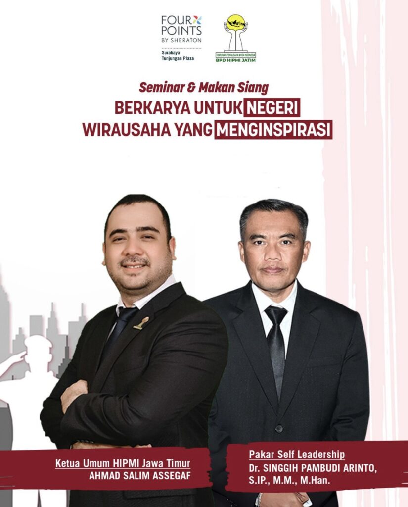 SURABAYA, Selasa 12 Agustus 2025 – Four Points by Sheraton Surabaya, Tunjungan Plaza kembali menghadirkan program yang menginspirasi komunitas bisnis dan wirausaha melalui acara Seminar & Makan Siang bertema “Berkarya untuk Negeri, Wirausaha yang Menginspirasi”. Kegiatan ini digelar di Cinnamon Room, Lantai L pada Sabtu 30 Agustus 2025 dan menghadirkan dua narasumber ternama: Ahmad Salim Assegaf, Ketua Umum HIPMI Jawa Timur, dan Dr. Singgih Pambudi Arinto, S.IP. ., M.M., M.Han., pakar Self Leadership.