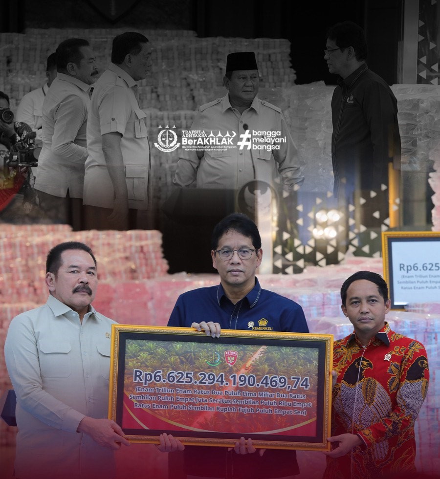 Penyerahan uang hasil penyelamatan kerugian negara dengan total senilai Rp 6.625.294.190.469,74 diserahkan secara simbolis oleh Jaksa Agung RI ST Burhanuddin kepada Menteri Keuangan RI.