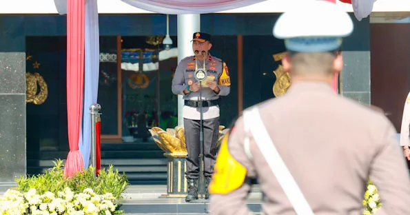 Apel dipimpin Wakapolda Jatim Brigjen Pol. Dr. Pasma Royce, S.I.K., M.H yang membacakan amanat Kapolda Jatim Irjen Pol Drs. Nanang Avianto, M.Si di Lapangan Mapolda Jatim, Senin (02/02/2026).