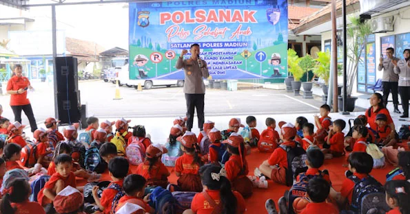 Kapolres Madiun AKBP Kemas Indra Natanegara, menyampaikan bahwa kegiatan Polisi Sahabat Anak merupakan salah satu upaya Polri untuk membangun kedekatan dengan generasi muda sekaligus memberikan edukasi tentang keselamatan berlalu lintas sejak dini.
