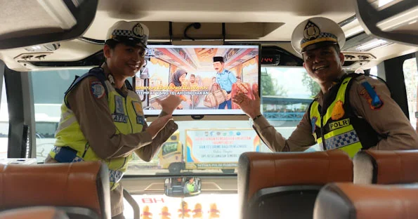 Salah satunya melalui program “Polantas Menyapa” dengan penayangan video keselamatan di bus angkutan penumpang.