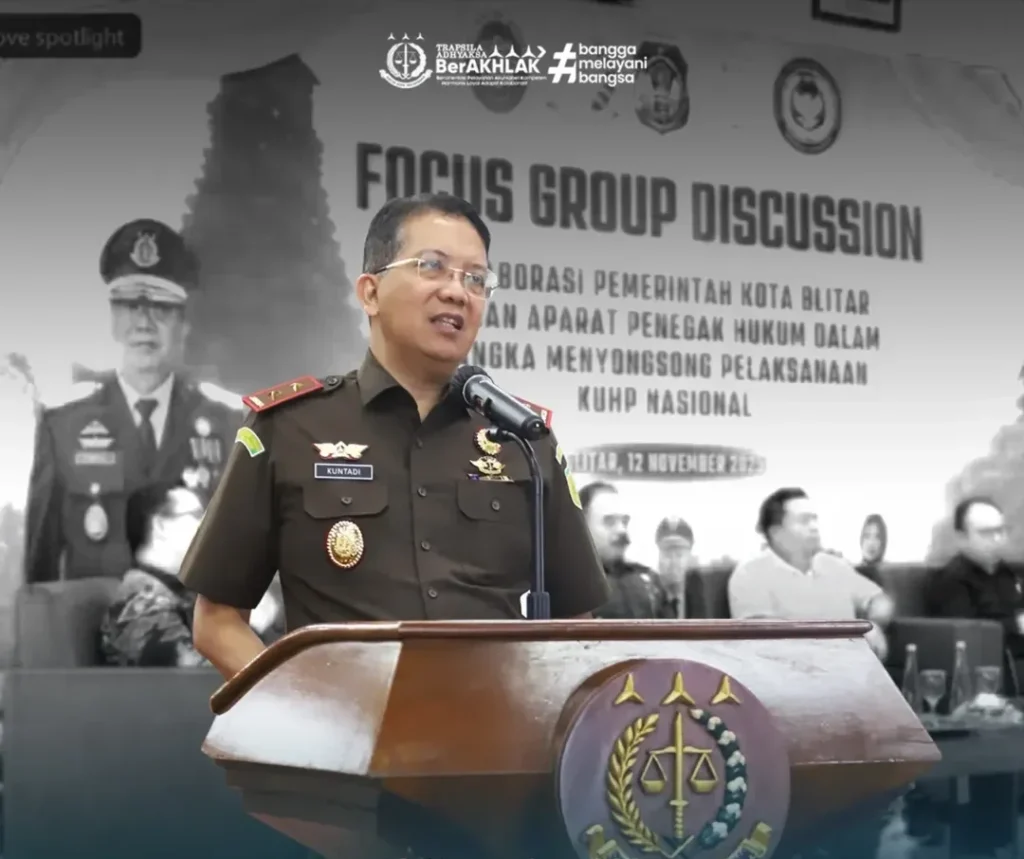 SURABAYA, Kamis 13 November 2025  Kepala Kejaksaan Tinggi Jawa Timur, Dr. Kuntadi, S.H., M.H., menjadi keynote speaker secara daring dalam kegiatan Focus Group Discussion (FGD) yang diselenggarakan oleh Kejaksaan Negeri Blitar bersama Pemerintah Kota Blitar, Rabu (12/11/2025).