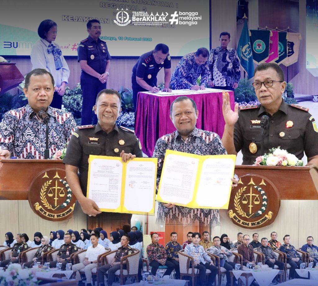 SURABAYA, Rabu 11 Februari 2026 – Kejaksaan Tinggi Jawa Timur bersama PT Perkebunan Nusantara (PTPN) I Regional 5 secara resmi menjalin kerja sama di bidang Perdata dan Tata Usaha Negara melalui penandatanganan Perjanjian Kerja Sama/Memorandum of Understanding (MoU) yang dilaksanakan di Aula Sasana Adhyaksa Kejati Jatim, Selasa (10/2/2026).
